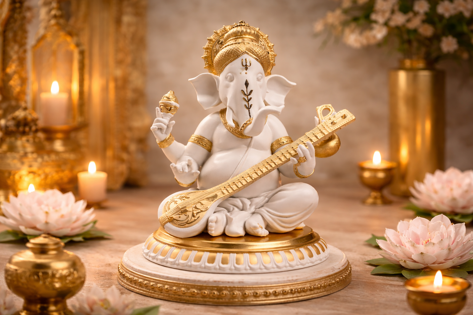 Radha Krishna Idol with Flute – Premium White & Gold Decorative Pooja Statue for Home Temple