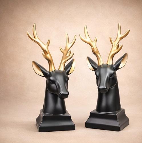 Elevate your interior with this striking set of two luxury deer head statues, crafted from premium resin with a sophisticated black finish and gleaming golden antlers. Each piece captures refined elegance, making them perfect statement showpieces for modern living rooms, offices, or contemporary décor schemes. The contrasting metallic accents add a touch of opulence while maintaining a minimalist aesthetic. Ideal for collectors and design enthusiasts seeking distinctive wall art or shelf displays that blend nature-inspired beauty with upscale home styling.
